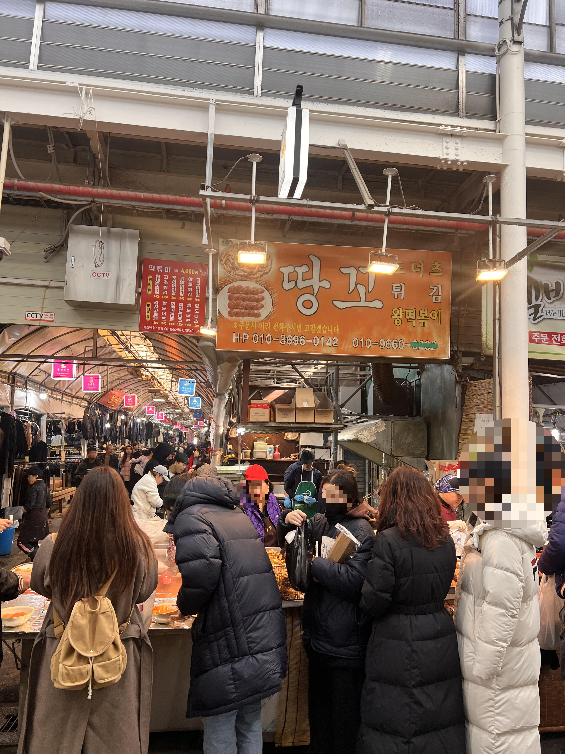 주문을 하면 20초만에 이모가 메뉴를 접시에 담아주십니다. 그걸 들고 땅꼬 뒤쪽에 있는 테이블에 앉아서 먹으면 됩니다. 테이블에 자리가 없을 수도 있는데 사람들이 금방 빠져줘서 빨리 앉을 수 있습니다. 위생이 그렇게 좋은 편은 아니지만 시장치고는 깔끔합니다.